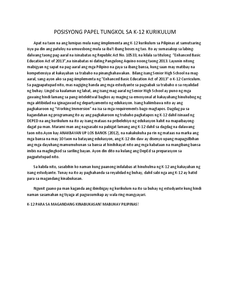 Ang K-12 program ay ang pagdagdag ng 2 taon sa basic kurikulum sa Pilipinas dahilayon sa DepEd ang Pilipinas ang huli sa mga bansa sa asya na nagpapatupad pa ngsampung taong basic education. Ang posisyong papel ay isang papel na nagbibigay ng posisyon ng may-akda ukol sa partikular na isyu. Posisyong papel halimbawa tungkol.