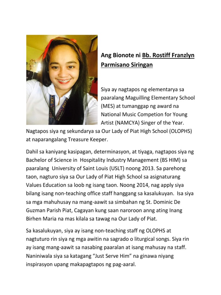 JOHNSON JONAS Isinilang sa lungsod ng Derry sa bansang Ireland at diyan siya nakapagtapos ng hayskul sa Coleraine. BIONOTE EXAMPLE OF BIONOTE HELPFUL EXAMPLE. Bionote tagalog halimbawa sa estudyante.