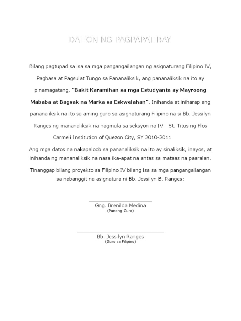 DAHON NG PAGPAPATIBAY Bilang pagtupad sa isa sa pangangailangan ng asignaturang Filipino 2. View MGA IDEYA NG MGA ESTUDYANTE SA PAKSAdocx from ENGLISH 1 at University of South Asia Lahore - Campus 1. Ang mga guro ay mahahalintulad natin bilang pangalawang magulang dahil sila ang maari nating.