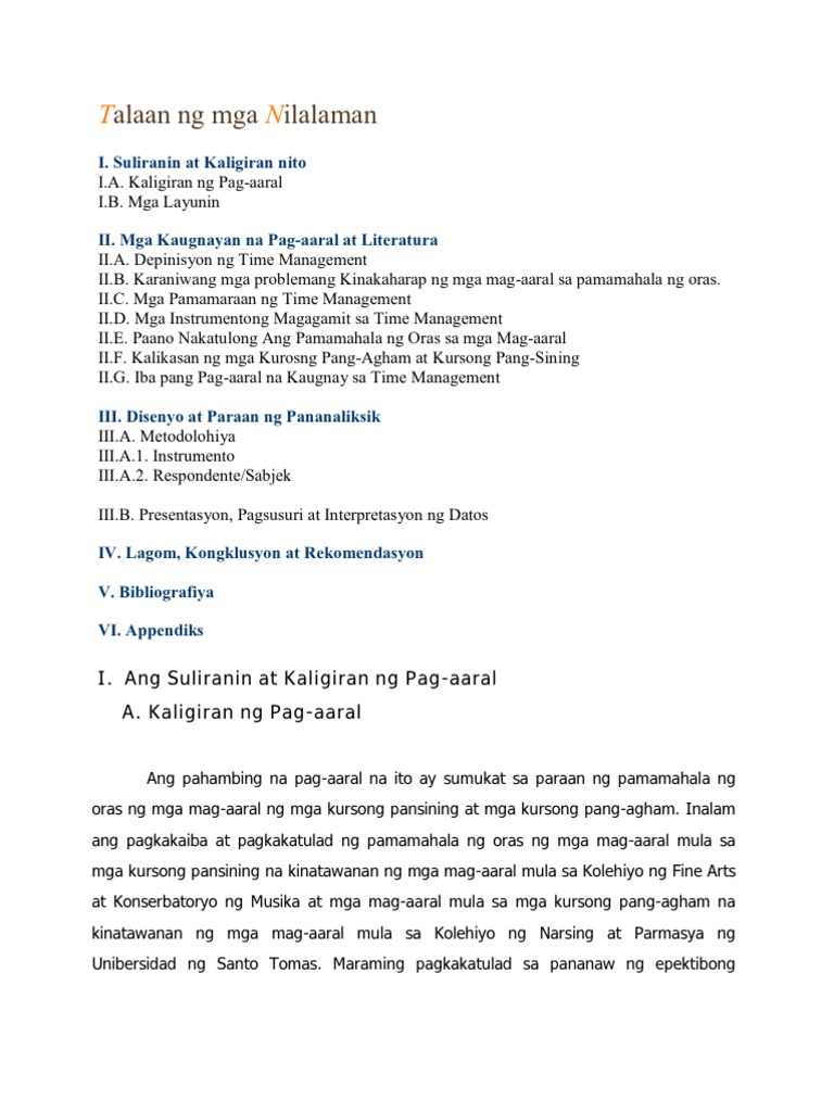 Ang pangunahing dahilan ng ganitong insidente ay ang hindi wastong paggugol ng oras o kawalan ng Time Management. Disenyo ng Pananaliksik Tinatalakay rito kung anong uri ng pananaliksik ang inyong ginamit sa inyong pag-aaral. Ang talatanungan ay ang pangunahing instrument ng pananaliksik.